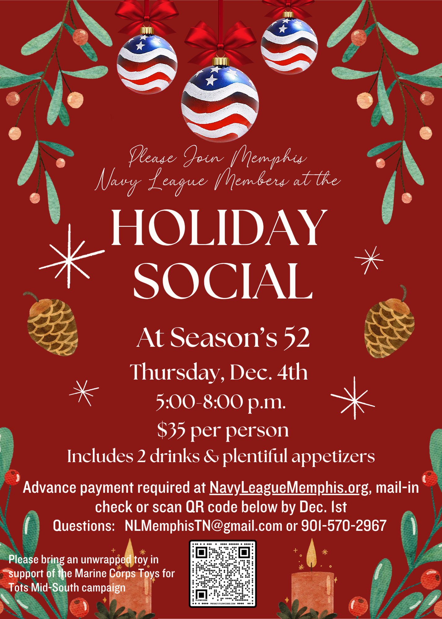 NAVY LEAGUE MEMPHIS HOLIDAY MEMBERSHIP SOCIAL We hope you can join us! Event capacity is limited, so please save your spot with advance payment. $35 per person - Includes 2 drinks & plentiful appetizers Reservation payment may be made online below or received in the mail by Dec.1 to: Navy League Memphis 2095 Exeter Rd., […]